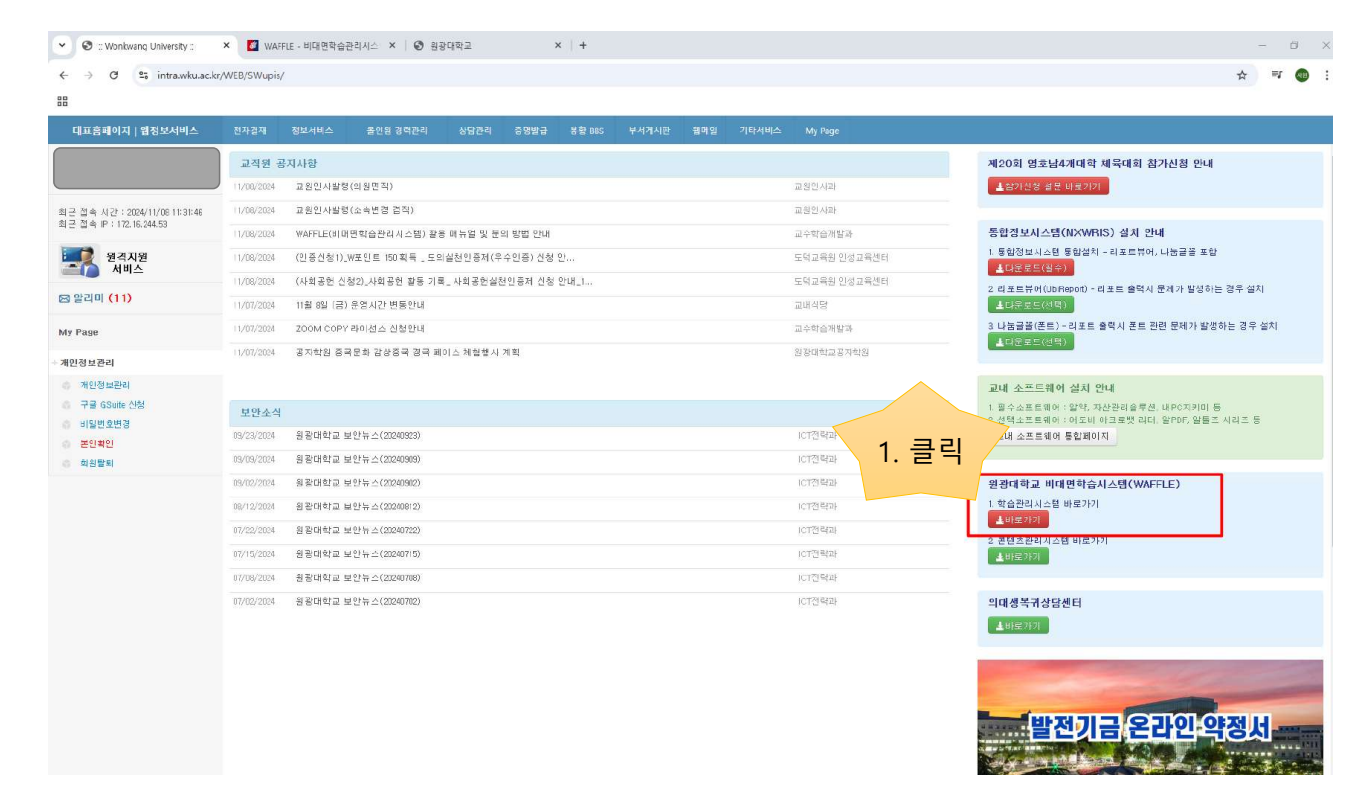 나. 수강방법: 웹정보서비스 로그인 → 원광대학교 비대면학습시스템(WAFFLE) 접속 → 마이클래스 → 2024-2 예비교원을 위한 성인지교육 클릭