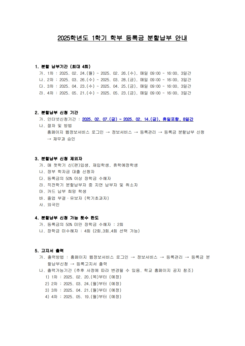 3) 2023-2학기부터 분할납부 신청 시 부모님 확인 사인 및 서류 접수를 받지 않고 인터넷 신청 및 재무과 승인으로 절차가 완료됩니다. (분할납부 대상자 공문발송 없음)