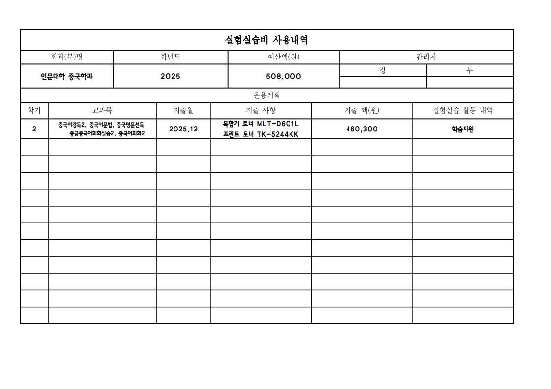 2025학년도 중국학과에 배정된 실험실습비의 사용 내역을 공개합니다.